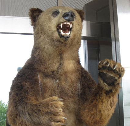 のぼりべつクマ牧場は山の上にある施設なので、辿りつくにはロープウェイを利用することになります。 山麓の駅となる建物の正面玄関にはもうすでに大きなヒグマ様の剥製が仁王立ちしておりました。 こういう大きなヒグマの剥製をみつけるとテンションが上がってしまいますねぇ〜 (^▽^*) うはは! 胸に下がる紹介板には名前や体格などの情報が載っていました。 ちょっと並んで記念撮影してみましょう・・・。 この政宗ヒグマ様は台座部分がかなり高い仕様になっていますから単純に横に並んでも背丈の比較にはならないのが残念・・・。 でも相当に大きなヒグマ様であったことは理解できるでしょ。 ヒグマの掌(てのひら)サイズと僕の頭部のサイズがほぼ同程度です・・・ 凄すぎます! 政宗ヒグマ様は中々に美男子であり凛々しい御顔立ちをしておりました。 近寄って眺めてみると牙や爪の鋭さも目立ちます。 ん〜 爪の大きさだけでも大人の中指サイズは楽勝にありますよ これ・・・。 やっぱりヒグマ様たちとは (*ω* ) 森の中では会いたくないっす 怖いよね ううむ。 とりあえず正面玄関前でウェルカムしてくれたヒグマ様との記念撮影は終了です。 チャキさんはこれからもっと沢山の『 剥製ではない! 生きたヒグマちゃんらと遭う! 』という大事な用事が控えているのです。 ここで何時までものんびりはしていられない。 さっそく建物の中へ入りロープウェイのチケットを入手して来ることといたしましょう♪ ーーーーーーーーーーーーーーーーーーーーーーーーーーーーーーーーーーーーーーーーーーーーーーー んで 建物の中へと入ってみました。 するとあちこちにヒグマの剥製が飾られています。 (;゜□゜) おお〜! ・・・・っといっても先ほど正面玄関前であった政宗ヒグマ様に比べれば小物感が否めません。 ここは軽く見流しておいてさっさとチケットを入手しにゆくチャキさん。 代金を支払い目的のチケットを手にしました☆ ( ̄ω ̄*) むふふ やったぜぇ♪ ロープウェイの利用券を買い求めるつもりでしたが、これが同時にクマ牧場の入園券も兼ねているらしい。 よしっ (;゜□゜)q これで悲願のクマ牧場見物が出来るのら! 汗ばむチケットを握りしめ山頂へ☆ いざ いざ レッツ ら GOひろみ♪ その2へ続く 小樽観光「 樽樽源 」トップへ戻る / あいらぶヒグマ(羆)ちゃん♪トップへ戻る |