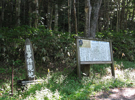 そんな勇者がいらっしゃるのであれば是非にもお会いしたいものです! 読者の方々もしっかりと現実を確認してください! 今 ちゃきさんはたった独りでここに居ます ↓ 左手奥に見えている黒く・・・そしてなんというかその・・・こん盛りとした辺り・・・・ヒグマですかね・・・? ってな会話が真面目に展開しそうな場所なんですよぉ~・・・・ (・ω・;) 洒落にならない・・・・。 怖いから素直に車を使って残り200mを進もう・・・。 っというわけでとうとう復元現地の本陣へと到着しました。 ここには『 あんない図 』が設置されていたよ。 ( ※画像をクリックすると拡大出来ます )そしてその近くには別な『 あんない看板 』もありました。 これね ↓ ガチョ━(;゜□゜)━━━━ン!! やっぱり出てるじゃねぇ~~かよぉ!!! これはいよいよもって車の外へは迂闊に出られません。 車窓からの臆病記念撮影に留めることにしよう・・・。 再現地には慰霊碑や史実を記した看板なども建っていました。 先の注意看板にも記載がありましたが、お供え物は野生のヒグマを呼びよせてしまうのでやめましょう。 お供え物として食べ物はダメだけれど、お花くらい持ってきても良かったのかもな・・・・。 香りが強くてここいらには自生していない花だと果実と同じ効果が残ってしまうかもしれないし、出来れば道すがらに咲いていた花とかをひとつふたつ摘んできて供えていく形でも良いかもしれません。 それなら問題もあるまいて・・・・。 【 つづく 】 あいらぶヒグマ(羆)ちゃんトップページへ戻る > 項目一覧へ戻る |